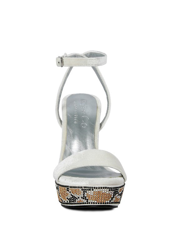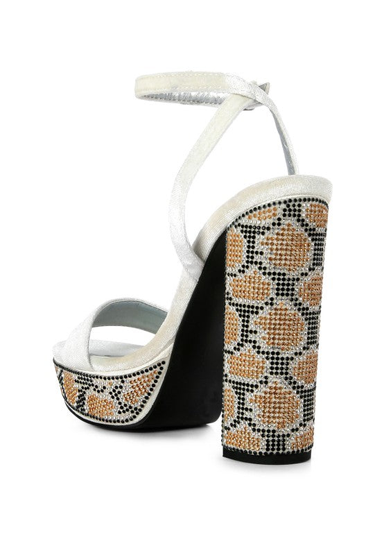 Beautifully heat set dew drop diamante in abstract collage design is all about glaming up with the Y2K trend taking up the mood this year. The velvet high block heeled sandal with just the right shine and height.